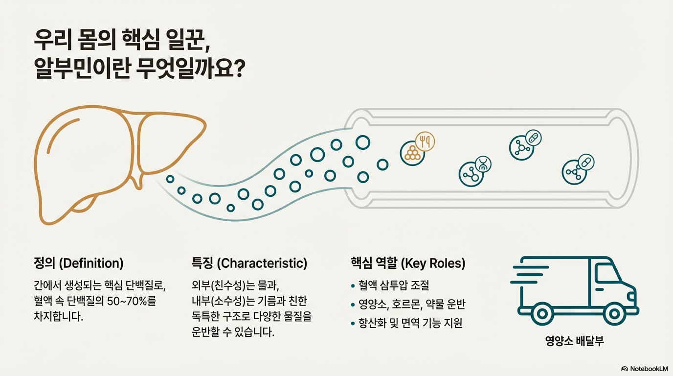 알부민은 간에서 생성되는 단백질로 혈액 속에 가장 많이 존재해요. 혈청 총단백의 **50~70%**를 차지하는 핵심 단백질이랍니다.