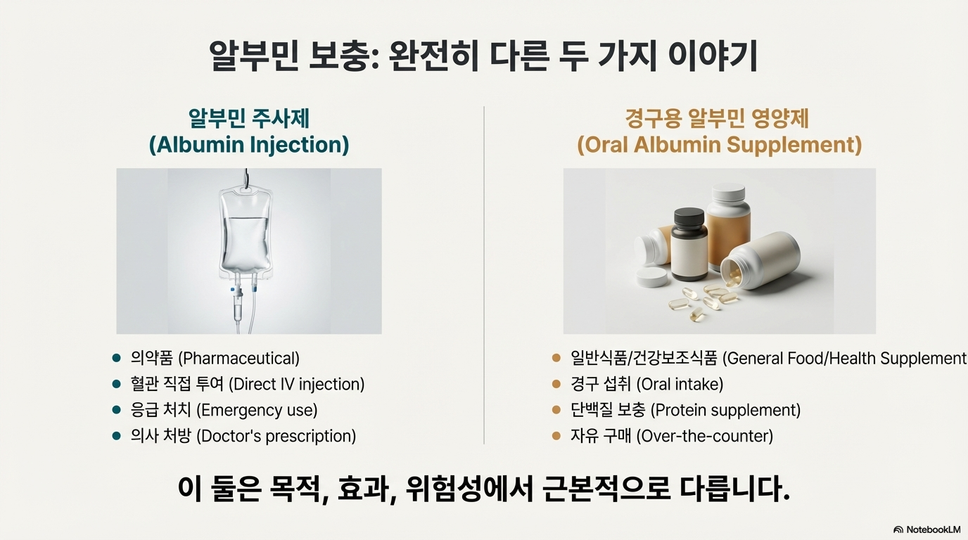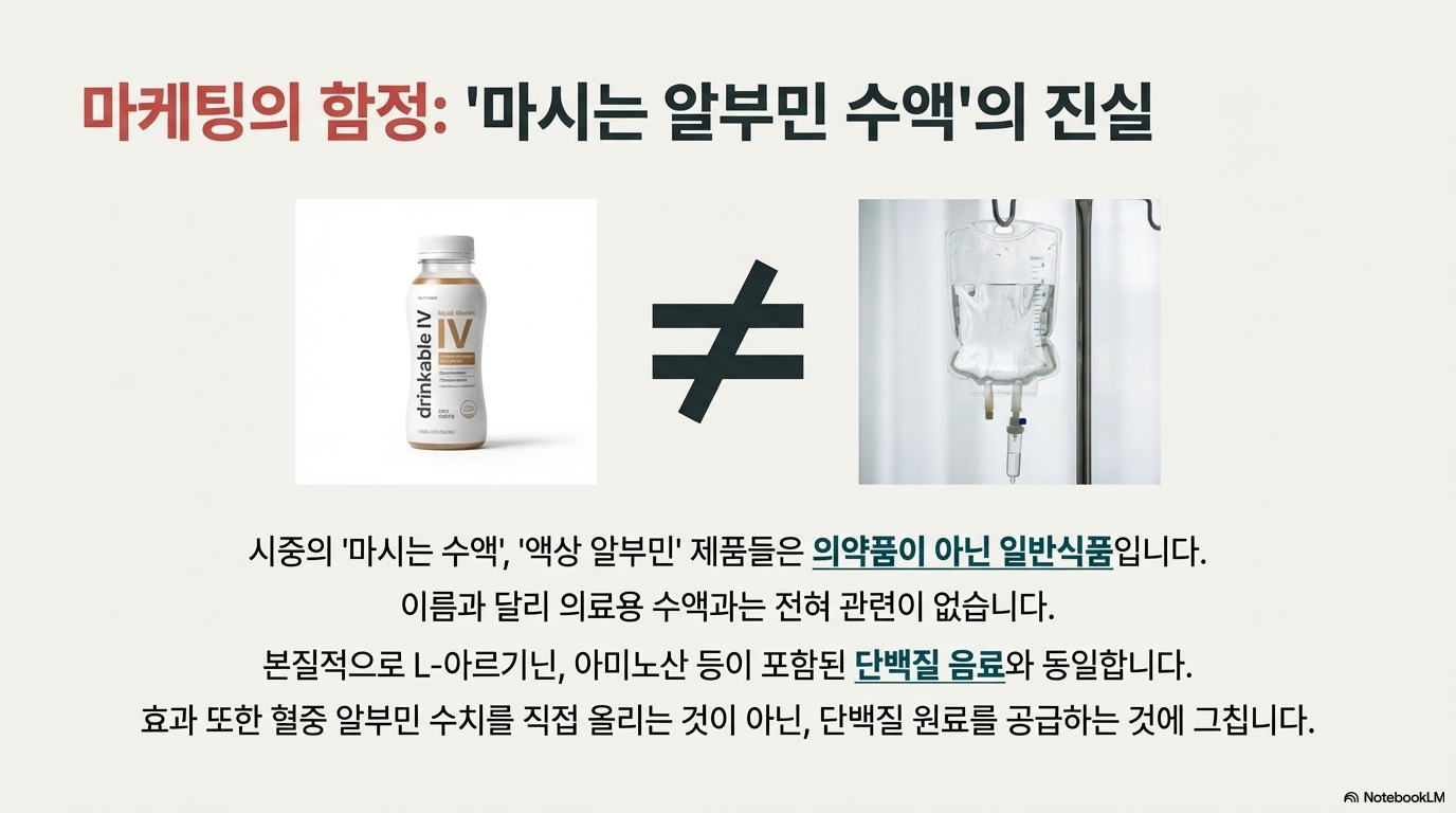 중요: '마시는 알부민 수액'은 실제 의료용 수액이 아니라 건강보조식품이에요. 단백질 음료와 동일한 효과예요!