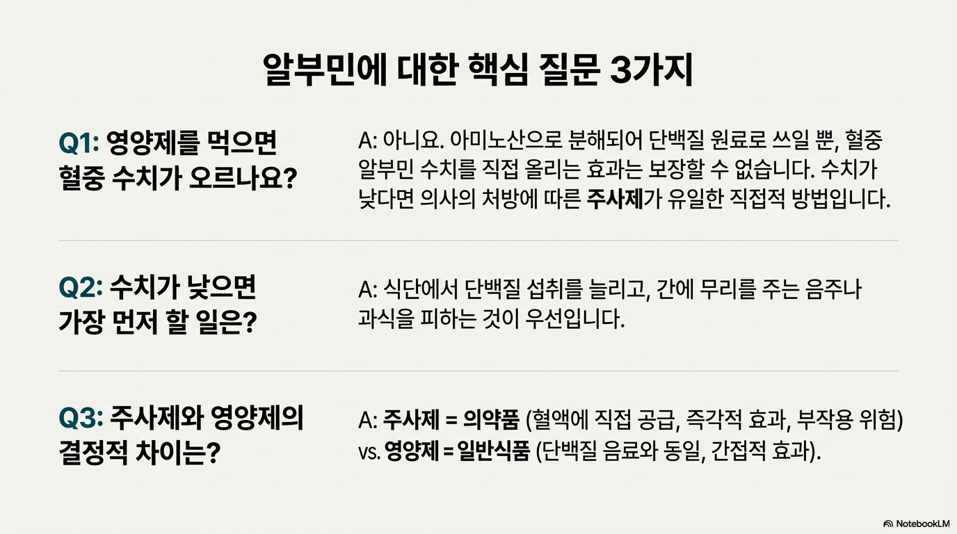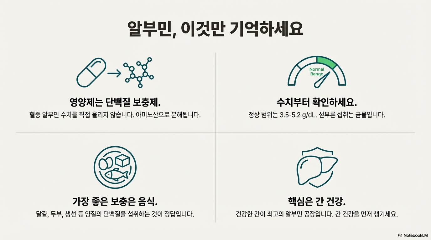 중요: 경구로 섭취한 알부민은 아미노산으로 분해되어 흡수되므로, 알부민 수치를 직접 올리는 효과는 보장할 수 없어요.