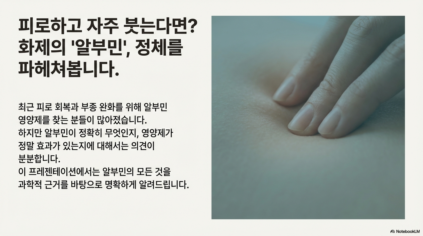 피로하고 자주 붓는다면 '알부민' 부족일 수 있어요. 최근 알부민 영양제가 인기를 끌면서 많은 분들이 관심을 갖고 계시는데요. 하지만 알부민이 정확히 뭔지, 정말 먹어야 하는지 헷갈리시죠? 알부민의 효능부터 부작용, 올바른 섭취방법까지 한 번에 정리해드릴게요!
