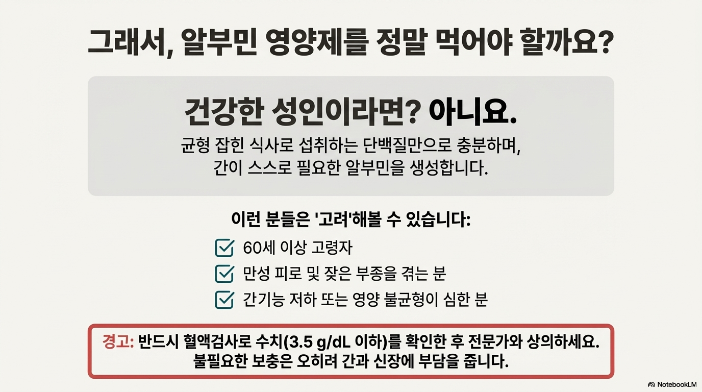 알부민 영양제를 먹기 전에 꼭 혈액검사로 수치를 확인하세요. 건강한 사람에게는 오히려 부담이 될 수 있어요. 무엇보다 균형 잡힌 식사와 간 건강 관리가 가장 중요하답니다!