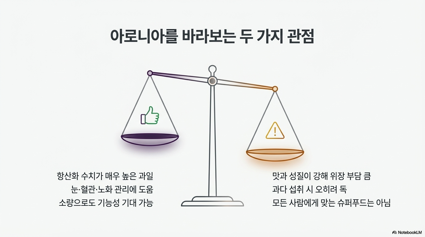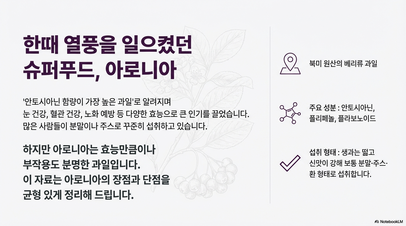 ‘안토시아닌 함량이 가장 높은 과일’로 알려진 아로니아는 한때 슈퍼푸드로 큰 인기를 끌었습니다. 눈 건강, 혈관 건강, 노화 예방까지 다양한 효능이 소개되면서 분말이나 주스로 꾸준히 섭취하는 분들도 많습니다. 하지만 아로니아는 효능만큼이나 부작용도 분명한 과일입니다. 이번 글에서는 아로니아의 장점과 단점을 균형 있게 정리해 드립니다.