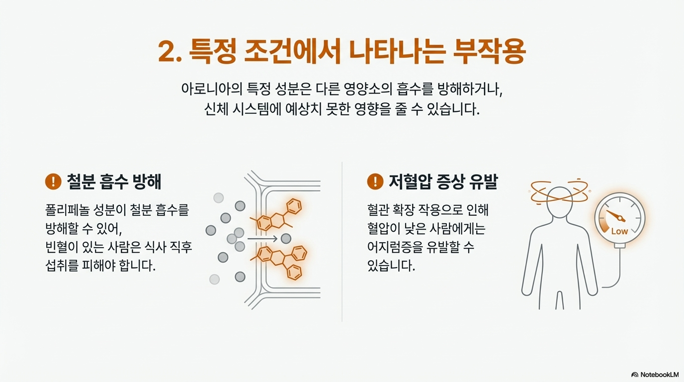 - 하지만 위장 자극, 설사, 철분 흡수 방해 같은 부작용도 존재합니다.