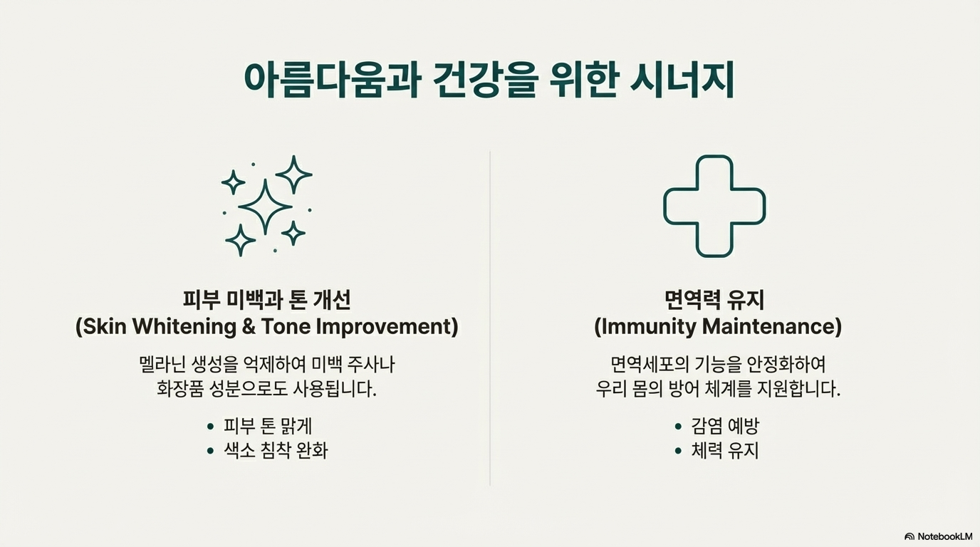 - 글루타치온은 항산화, 간 해독, 피부 톤 개선에 도움을 줄 수 있습니다.