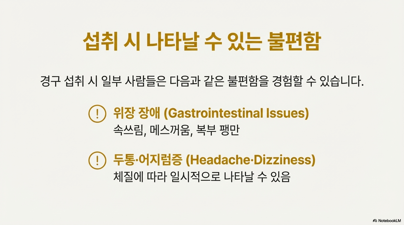 - 하지만 위장 장애, 두통, 과다 섭취 위험이라는 부작용도 존재합니다.