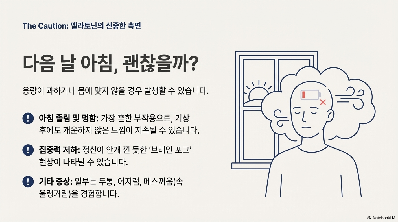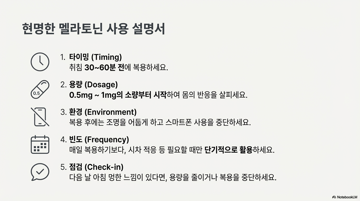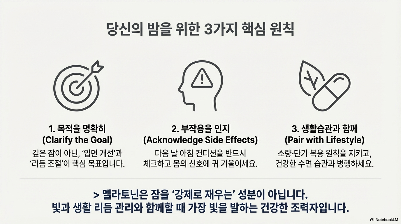 👉 멜라토닌은 수면제를 대체하는 약이 아니라 ‘리듬 조절 보조제’에 가깝습니다.