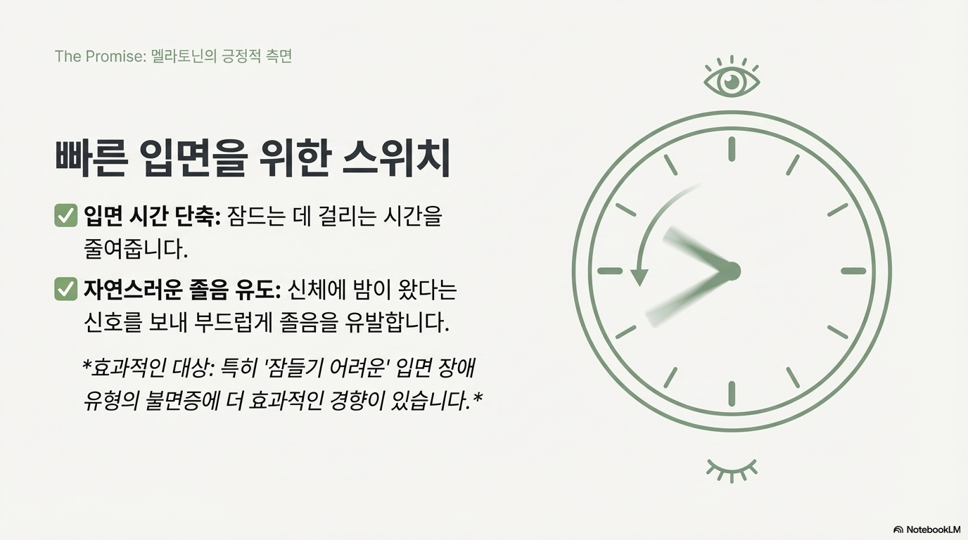 - 멜라토닌은 입면 개선과 생체 리듬 조절에 도움을 줄 수 있습니다.