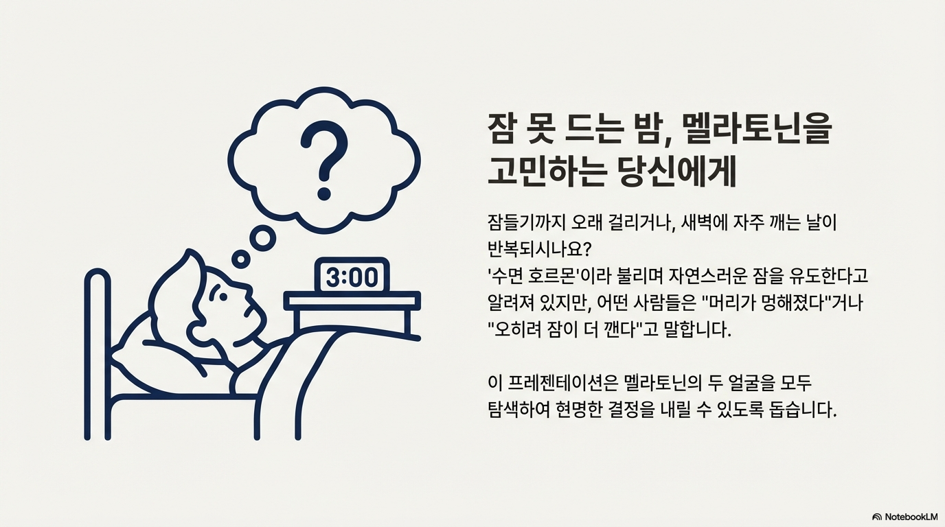 잠들기까지 오래 걸리거나, 새벽에 자주 깨는 날이 반복되면 멜라토닌이라는 이름을 한 번쯤 들어보셨을 겁니다. ‘수면 호르몬’으로 알려진 멜라토닌은 자연스럽게 잠을 유도한다고 알려져 있지만, 한편으로는 “머리가 멍해졌다”, “오히려 잠이 더 깨는 느낌”을 호소하는 사람도 있습니다. 멜라토닌은 분명 도움이 될 수 있지만, 모든 수면 문제의 해답은 아닙니다. 지금부터 효능과 부작용을 균형 있게 살펴보겠습니다.