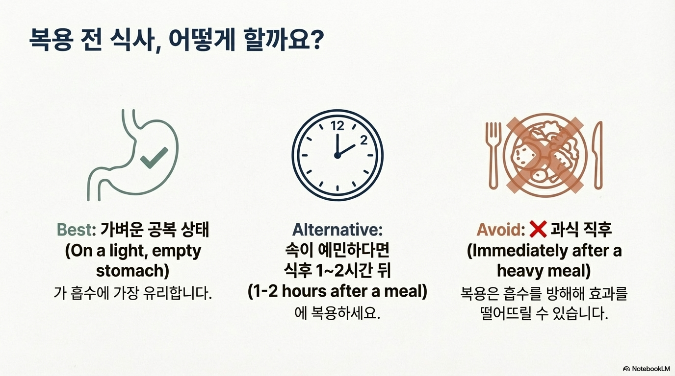 - 속이 예민하면 식후 1~2시간 뒤 복용