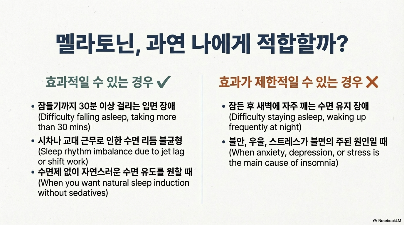 👉 멜라토닌의 정답은 “많이”가 아니라 “정확하게”입니다. 내 몸의 반응을 기준으로 조절하는 것이 가장 안전한 복용법입니다.