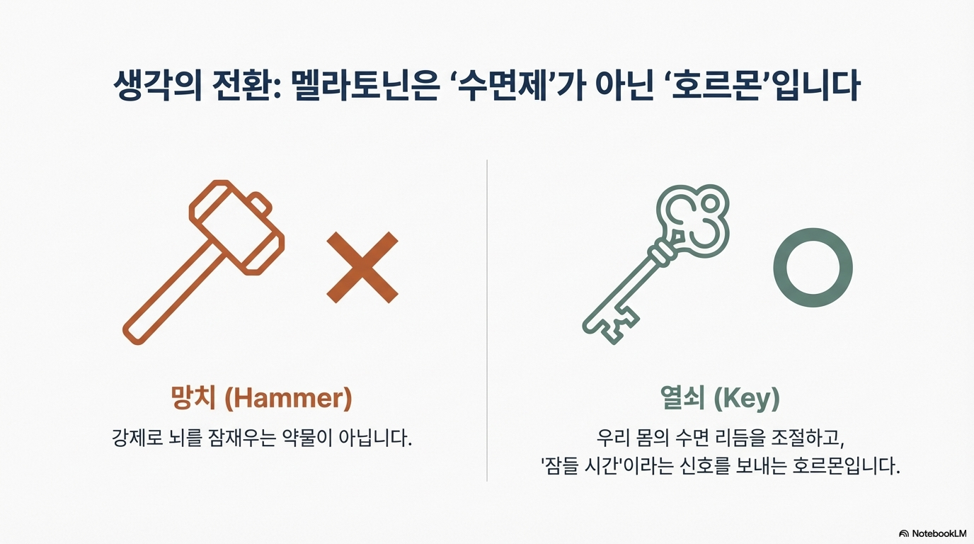 - 멜라토닌은 수면제가 아니라 수면 리듬(입면)을 돕는 호르몬