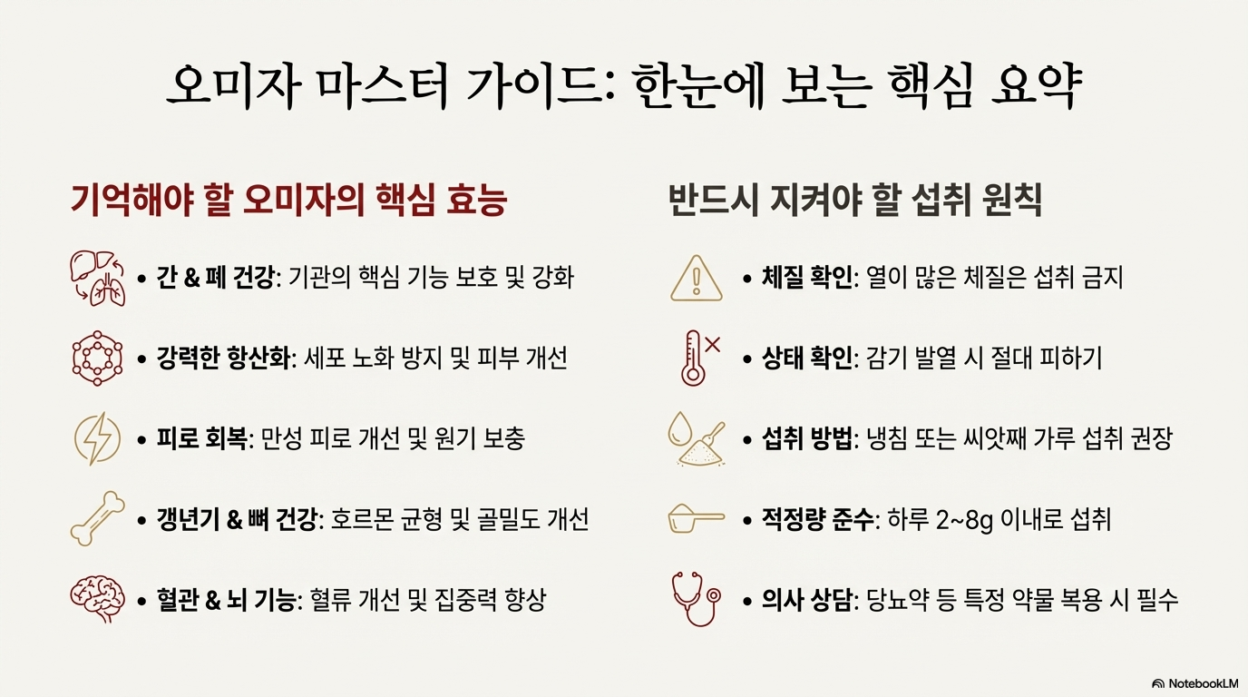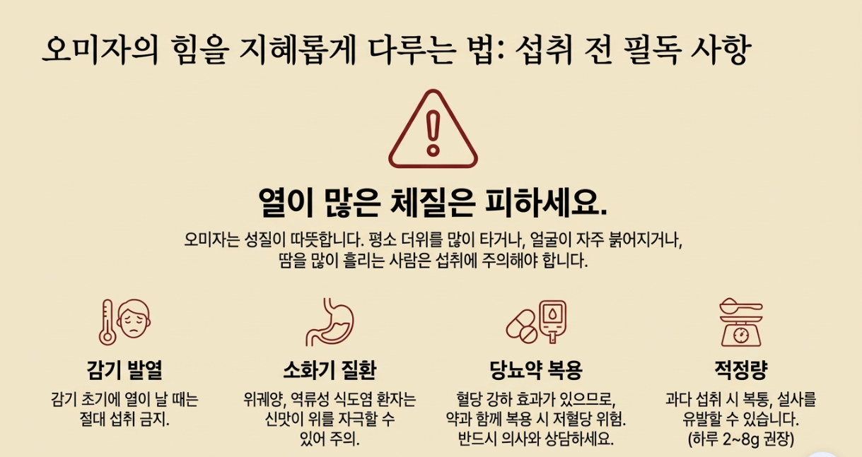 오미자는 정말 좋은 약재지만, 체질에 따라 독이 될 수도 있어요. 특히 열이 많거나 감기로 열이 있을 때는 절대 먹지 마세요!