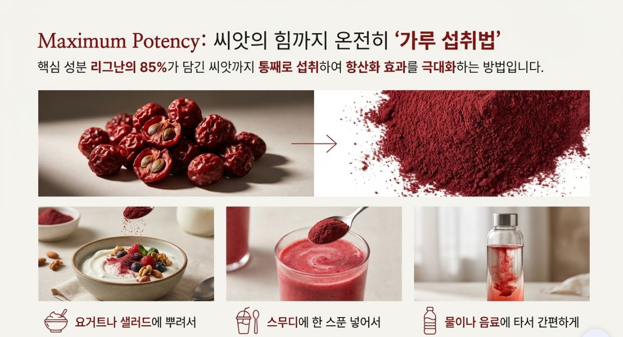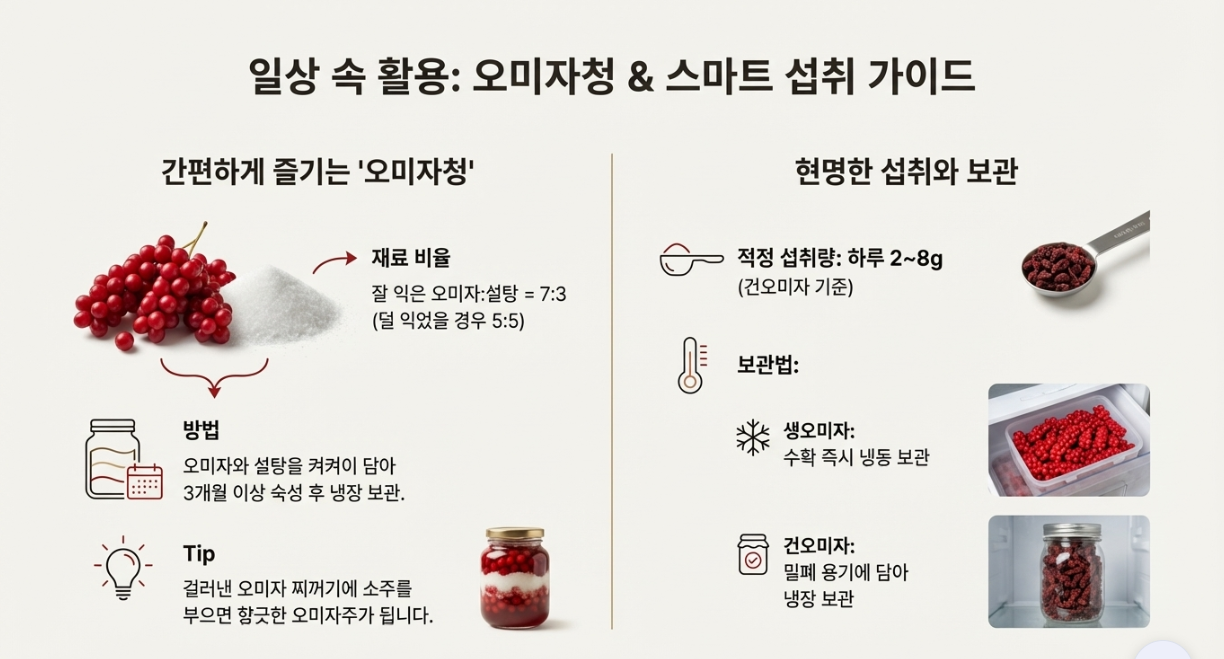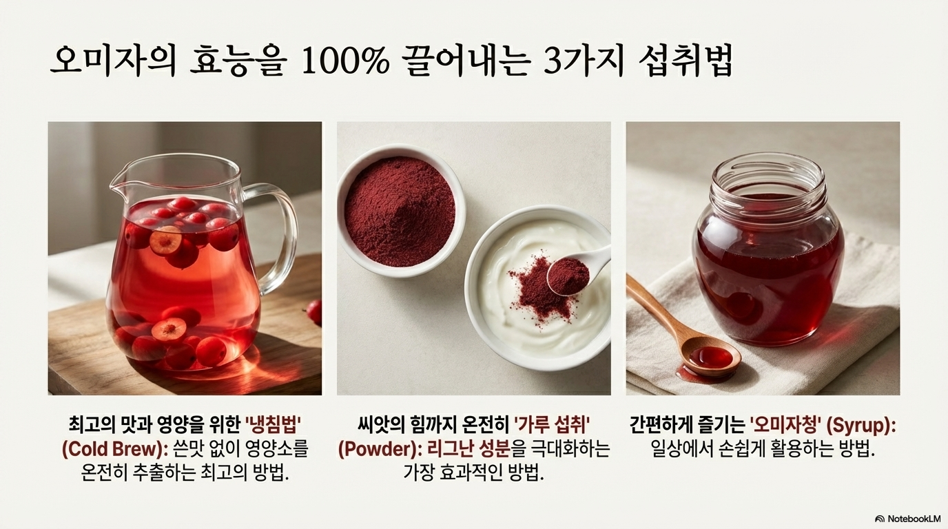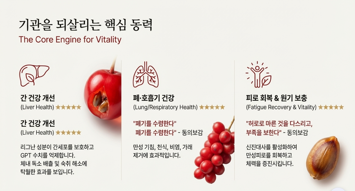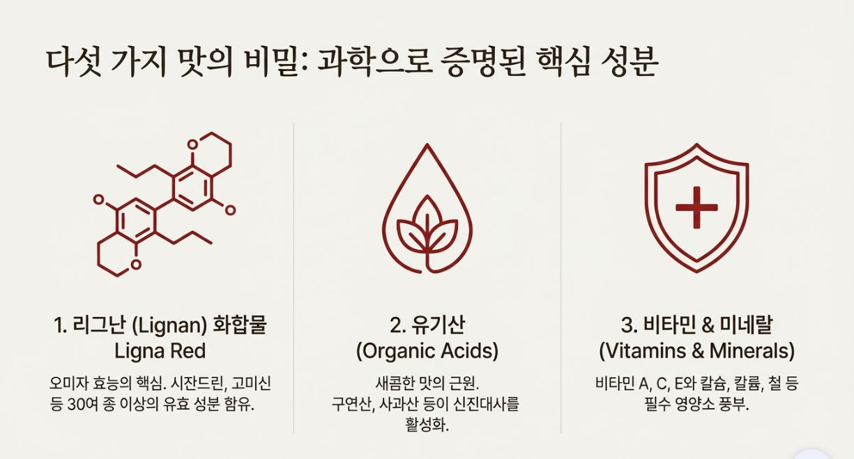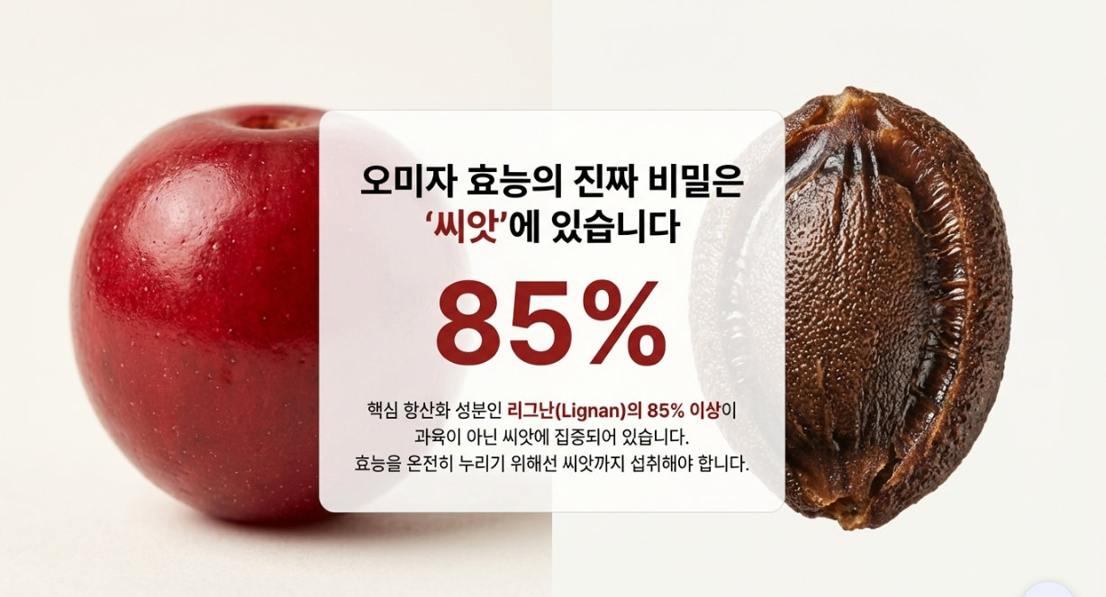 특히 리그난 성분의 85% 이상이 오미자 씨에 집중되어 있어서, 씨까지 함께 먹어야 진짜 효능을 누릴 수 있어요!