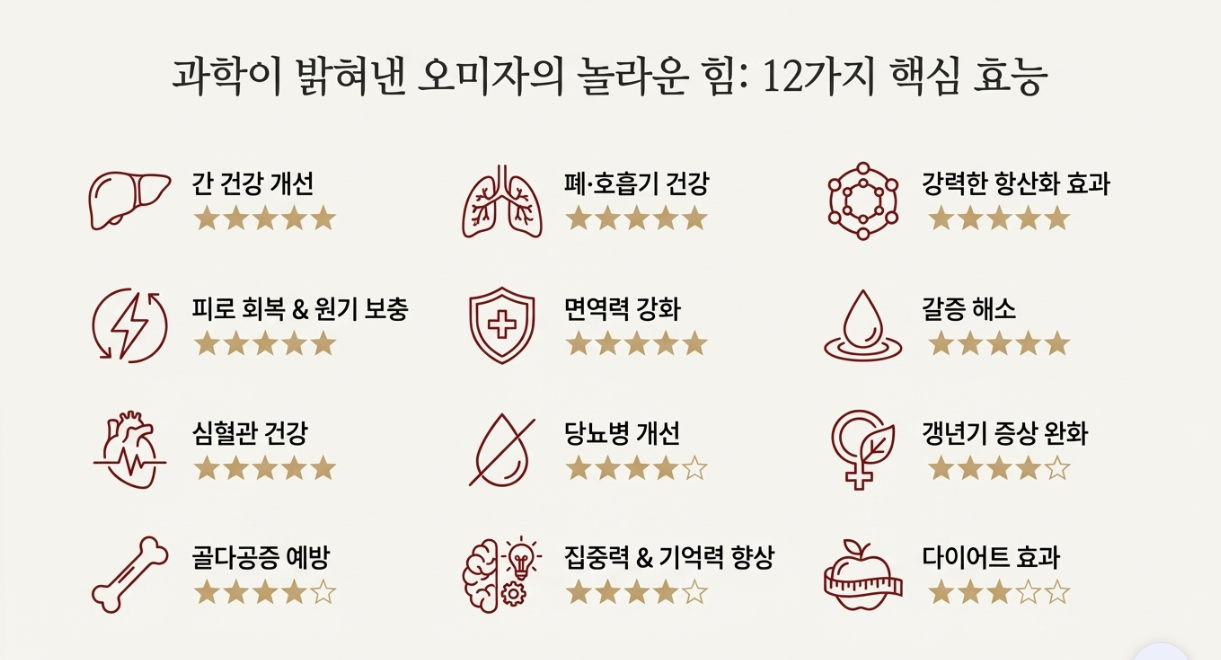 여름만 되면 생각나는 시원한 오미자차! 새콤달콤한 맛도 일품이지만, 건강 효능도 뛰어나다는 사실 알고 계셨나요? 동의보감에서 "몹시 여윈 것을 보하며, 눈을 밝게 하고, 양기를 세게 한다"고 극찬했던 오미자! 기원전 300년 전 이집트부터 사용된 이 열매는 현대 과학으로도 그 효능이 입증되고 있어요. 오늘은 오미자의 놀라운 효능부터 꼭 알아야 할 부작용, 올바른 섭취방법까지 완벽하게 알려드릴게요!