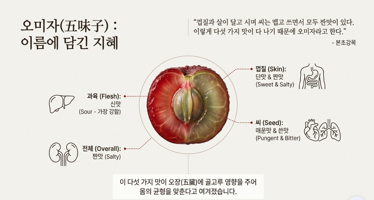 본초강목에서는 "껍질과 살이 달고 시며 씨는 맵고 쓰면서 모두 짠맛이 있다. 이렇게 다섯 가지 맛이 다 나기 때문에 오미자라고 한다"고 기록했어요. 이 다섯 가지 맛이 오장(심장, 폐, 신장, 위, 비장)에 골고루 영향을 준다고 해서 예로부터 만병통치약처럼 여겨졌답니다!